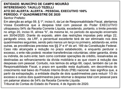 O Tribunal de Contas do Estado publicou nesta sexta-feira alerta para a prefeitura de Campo Mourão.