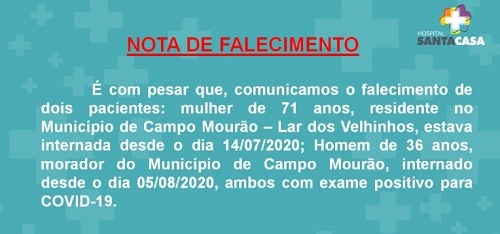 A Santa Casa de Campo Mourão informou mais duas mortes por coronavirus nesta sexta-feira. Uma delas foi um homem de 36 anos, que tinha sido internado na quarta-feira. A outra é uma mulher de 71 anos, interna no Lar dos Velhinhos. Foi o nono óbito no asilo. Campo Mourão tem agora 21 mortes por covid-19.