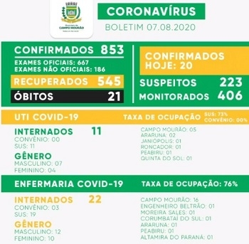 Mais 20 casos de covid foram confirmados nesta sexta-feira em Campo Mourão. O total foi a 853. Houve 20 recuperados e eles agora são 545. O número de suspeitos cresceu de 177 para 243 (+46). São 287 as pessoas da cidade com o vírus, no momento.