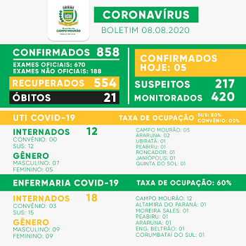 Cinco casos de coronavírus foram confirmados neste sábado em Campo Mourão. O total foi a 858. Houve nove recuperados e eles agora são 554. Pelos dados oficiais, o município está, no momento com 283 moradores com o vírus.