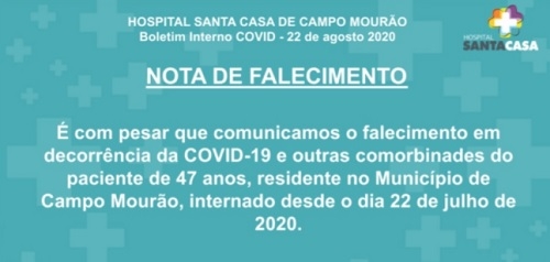 A Santa Casa confirmou neste sábado a morte por covid-19 de um morador de Campo Mourão, de 47 anos. Ele tinha outras comorbidades e estava internado desde o dia 22 de julho. Agora são 26 óbitos por coronavírus em Campo Mourão e 85 na região.