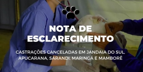 A van com a equipe da empresa Patas de Ouro, contratada pelo governo do Estado para as castrações de cães e gatos, sofreu acidente nesta sexta-feira a 160 km de Maringá. Por causa disso, todas as ações que estavam marcadas para este mês foram canceladas. Isso inclui Mamborê, onde as castrações estavam agendadas para os dias 29 e 30.
