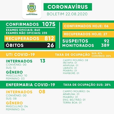 Sobre covid, a boa notícia do sábado para Campo Mourão é que o número de casos confirmados (6) voltou a ficar bem abaixo dos recuperados (27). E número de mourãoenses com o vírus ativo caiu mais um pouco (237).
