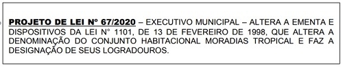Um dá nome para uma praça, outra altera a lei que alterou o nome de conjunto e outro trata de crédito para a Fecam.