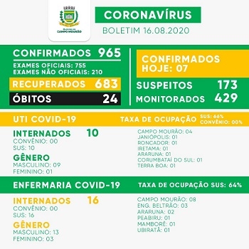 Domingo de sete novos casos confirmados de coronavírus em Campo Mourão. Em compensação, houve oito recuperados. No total, são agora 965 confirmações e 683 recuperações. No momento, a 258 moradores do município estão com o vírus ativo. Na ala covid da Santa Casa, são 10 leitos ocupados na UTI (66%) e 16 na enfermaria (64%).