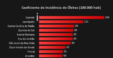 Janiópolis não é mais, proporcionalmente, o terceiro município do Paraná em mortes por covid-19. Agora é segundo. Com seis óbitos e 5,3 mil habitantes, tem o índice de 111 mortes por 100 mil habitantes. Só Itambé, com 164, está à frente. Outra cidade da região, Quinta do Sol (4 óbitos), aparece em quarto lugar no Estado (86 por 100 mil).