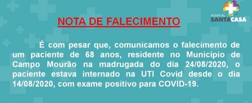 A Santa Casa confirmou nesta segunda-feira a morte de homem de 68 anos que estava internado por covid-19 desde o último dia 14. É o 27° óbito pela doença em Campo Mourão e o 87° na região. A vítima era o advogado Ademar Issi, que foi procurador geral da prefeitura na gestão de Rubens Bueno (1993/96).