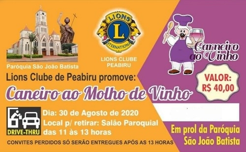 A prefeitura de Peabiru baixou até decreto para cancelar a Festa do Carneiro ao Vinho deste ano, por causa da pandemia. Mas o prato típico será servido no próximo domingo em promoção do Lions Clube. Como? Pelo sistema drive thru. Custa R$ 40 e deverá ser retirado a partir das 11h no salão paroquial. A renda será em prol da paróquia São João Batista.