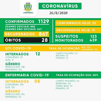 Vírus ativo - A quarta-feira teve mais 23 casos confirmados. O total foi a 1.129, com 827 recuperados (15 no dia). Os moradores de Campo Mourão com o vírus no momento são 234. O número de casos suspeitos voltou a subir (124).