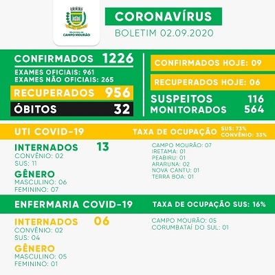Novos casos - O Boletim Covid desta quarta-feira trouxe mais nove casos em Campo Mourão e o total foi a 1.226. As recuperações foram seis e total passou a 956. Os mourãoenses com o vírus ativo são 238.