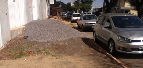 Na av. Goioerê, pedras ocupam toda a passagem dos pedestres no passeio público.