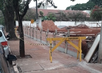 Rua Francisco Albuquerque, no centro de Campo Mourão. O imóvel é da prefeitura, que prefeitura fechou toda a calçada e deixou o pedestre sem opção.