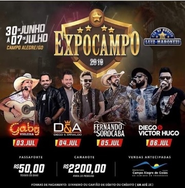 Quem disse que a Expocampo acabou? Começou neste domingo e segue até domingo que vem. Tem rodeio e shows, um deles com a dupla Fernando & Sorocaba. Mas calma. Não é a exposição de Campo Mourão, não. Essa Expocampo é a de Campo Alegre de Goiás, uma cidade de menos de 8 mil habitantes. Hummmm...
