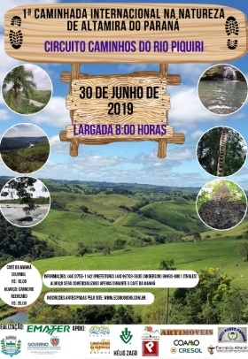 Altamira do Paraná realiza no próximo domingo a 1.a Caminhada Internacional na Natureza Será o circuito Caminhos do Rio Piquiri, com cerca de 12 km entre trilhas e estradas rurais. A participação é gratuita, mas há as opções de café da manhã (R$ 10) e almoço (R$ 20). Detalhe: o almoço será carneiro recheado, o prato típico do município.