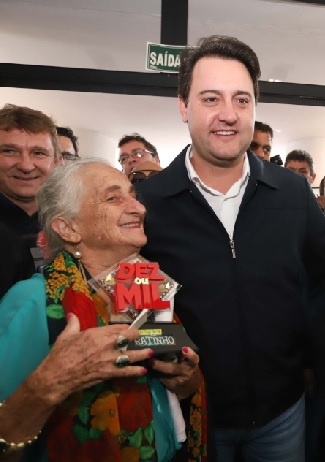 Por falar em Ratinho Jr em Campo Mourão, olha só quem foi ao Teatro Municipal para uma tietagem básica: Cida Gaiteira. Fez pose ao lado do homem e tudo. Repare que ela levou até o troféu que ganhou por participação no programa do pai do governador, no SBT. Cida se apresentou em novembro no "Programa do Ratinho" e ganhou R$ 1 mil no quadro "Dez ou Mil".