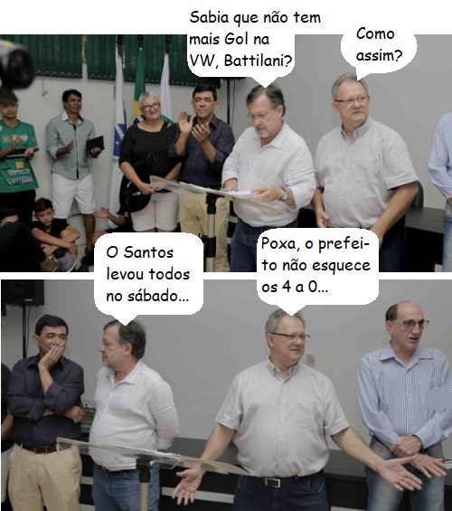 Os cliques são desta terça-feira, durante assinatura dos termos da Lei de Incentivo ao Esporte. O prefeito palmeirense Tauillo Tezelli ficou ao lado do vereador santista Edson Battilani. Isso depois de Palmeiras 4 a 0 no Santos, sábado. Também estão nas fotos os vereadores Elvira Schen (Coritiba), Sidnei Jardim (Flamengo) e Olivino Custódio (Corinthians).