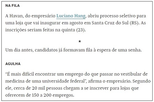 As longas filas em busca de emprego em futuras lojas da Havan foram temas de notas na Folha de S. Paulo desta sexta-feira. Foi na coluna de Monica Bergamo. Só não se refere a Campo Mourão, não. Fala só de Santa Cruz do Sul/RS, onde a rede também deve chegar em agosto. Assim como cá, a fila lá também começou na véspera da distibuição das senhas.
