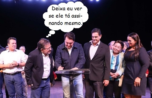 Olha aí mais um clic da visita do governador Ratinho Jr a Campo Mourão, na quarta-feira, Desta vez ele aparece assinando a liberação de recursos para a cidade e é atentamente observado pelo prefeito Tauillo Tezelli. ah, gato escaldado tem medo de água fria...