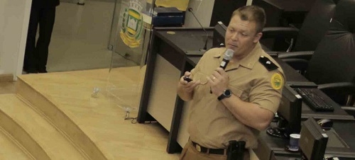 Tenente Marco Duarte, comandante do Pelotão de Trânsito do 11º BPM, durante o Fórum de Trânsito que marcou o encerramento do Maio Amarelo em Campo Mourão; quinta-feira.