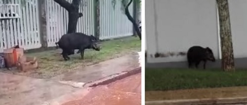 Olha quem apareceu neste sábado, na rua dos Álamos, no jardim Araucária. Um porco do mato. Aparentemente estava com uma pata machucada.