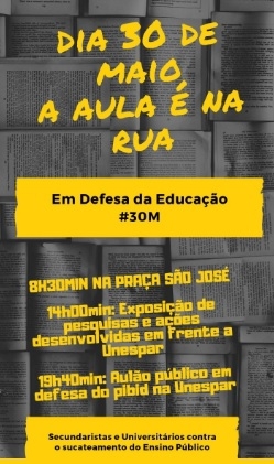 Cartaz exibido durante manifestação de estudantes de Campo Mourão contra os cortes do governo na educação, nesta quinta-feira. A manifestação começou na praça São José logo pela manhã e seguiu em passeata para a Unespar, onde houve uma série de atividades durante o dia e à noite.
