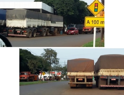 Na av. Guilherme de Paula Xavier, perto da entrada do Lar Paraná, caminhões estacionam sobre as calçadas.