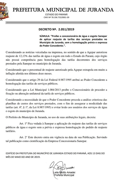 Lembra ainda que lei de 2013 proíbe que a concessionária (Sanepar) altere tarifas públicas de forma unilateral.