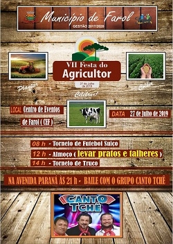 A prefeitura de Farol confirmou para o próximo dia 27 a Festa do Agricultor. A sétima edição terá torneio de futebol suíço (8h), almoço (12h), torneio de truco (14h) e, pra fechar o dia, baile com o grupo Canto Tchê (21h). A programação acontece no Centro de Eventos, mas show será na av. Paraná.