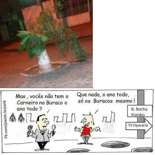 Os buracos na esquina da rua Rocha Pombo com a travessa Operária, em Campo Mourão, estão famosos. Na quarta-feira viraram quadrinho do Larpank, publicado no Facebook do cartonista Pixote. Nesta quinta-feira ganham decoração especial. E agora apareceram na Boca Santa, né?...