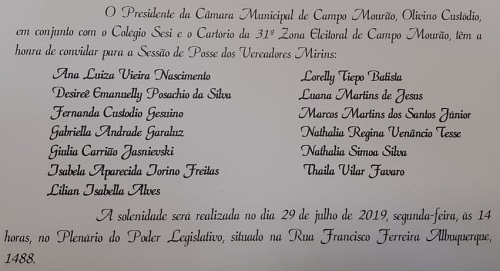 A Câmara de Campo Mourão está em recesso de julho, mas a Câmara Mirim começa a trabalhar nesta segunda-feira (14h), É quando acontece a solenidade de posse. São 12 alunas e um aluno do colégio Sesi, o único que participou do projeto "Parlamento Jovem", do TRE/PR. O grupo tem entre 14 e 16 anos.