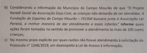 O Ministério Público cobrou ações da prefeitura de Campo Mourão sobre alunos de projeto de caratê.