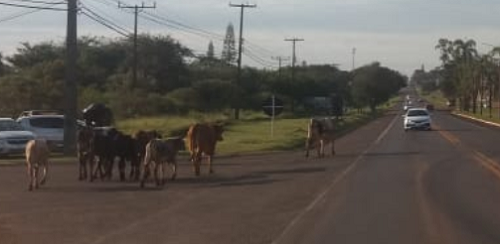 A Estrada Boiadeira é outra. O gado, em foto desta sexta-feira à tarde, está na BR-158, na saida para Maringá, bem em frente à concessonária Chevrolet. Até o prefeito Tauillo Tezelli passou pelo local na hora da invasão bovina.