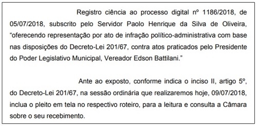 A representação contra Battilani foi apresenta por Paolo de Oliveira, que é servidor de carreira da Câmara.
