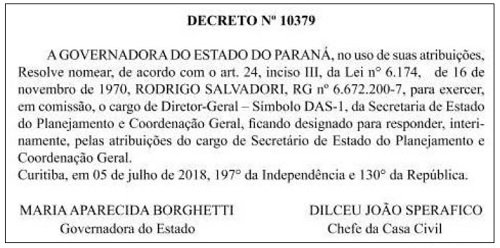 A nomeação da governadora Cida Borghetti já foi publicada.