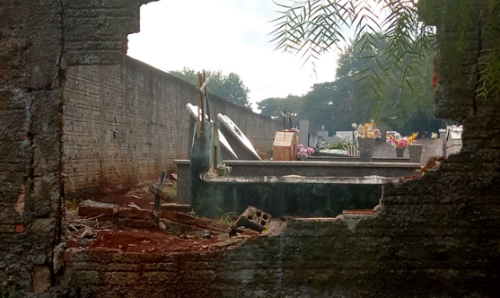 A foto é do Cemitério Municipal de Iretama. Parte do muro está quebrada e deixa túmulos com "visão privilegiada". Além disso, tem muito lixo, entulho e galhada ao redor do "campo santo", inclusive próximo ao portão. O estado do cemitério foi assunto na segunda-feira na sessão da Câmara de Vereadores.