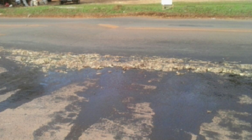"Em frente ao Parque de Exposições algum caminhao carregado com barrigada ou sei lá o quê, derrubou no quebra-molas. Ficou uma carniça!"