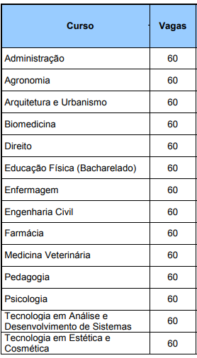 Também estão abertas as inscrições para o vestibular na modalidade à distância. São sete cursos, todos com inscrições gratuitas - Administração, ciências contábeis, educação física, gestão de RH, letras (português), pedagogia e processos gerenciais.