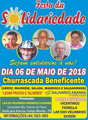 Ainda tem convites à venda para a Festa da Solidariedade que o Lar dos Velhinhos Frederico Ozanan promove neste domingo em Campo Mourão. O convite custa R$ 70 e dá direito a um churrasco de 2 kg. Quem comprar pode comer no local ou levar para casa. Também é possível comprar complementos à parte - arroz, maionese, salada.