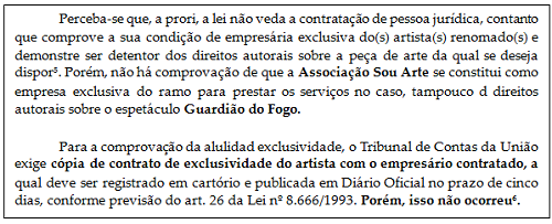 O MP Alega ilegalidade na inexigibilidade de licitação para contratação do espetáculo "Guardião do Fogo".