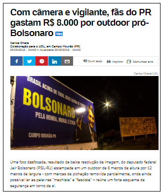 Outdoor em apoio ao deputado Jair Bolsonaro (PSL), em Campo Mourão, virou reportagem no portal UOL. Diz que fãs do parlamentar gastam R$ 8 mil para manter a propaganda, que tem iluminação e câmera de monitoramento. O sistema de segurança foi adotado após atos de vandalismo. O custo é bancado por "vaquinha" entre empresários e agricultores. A reportagem é de Carlos Ohara.