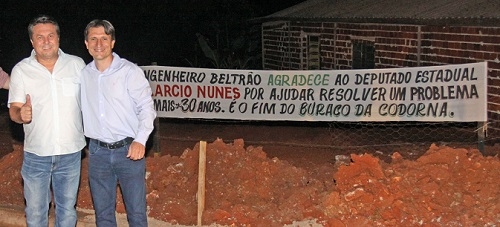 A prefeitura de Engenheiro Beltrão realizou solenidade nesta quinta-feira para anunciar R$ 7 milhõs em obras e ações para o município liberados pelo Estado. O deputado Márcio Nunes, que ajudou na libereção do recursos, participou. Uma das obras pedida há tempos pela comunidade era o fim do "buraco da codorna", uma grande erosão que já mais de 30 anos assustava moradores próximos.