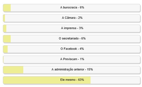 "O que mais está atrapalhando o prefeito Tauillo Tezelli?" Enquete com essa pergunta foi encerrada neste domingo. Venceu a alternaltiva "Ele mesmo", com 63% dos votos. Uma lavada. A alternativa segunda colocada - "A administração anterior" - teve apenas 15%. Nenhuma outra chegou a 10%. O resultado completo está no quadro acima.