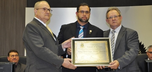 Teve sessão solene da Câmara nesta quarta-feira. Motivo? Entrega da Comenda 10 de Outubro para o Rotary Araucária, que está complentando 20 anos. O vereador-autor Edson Battilani e o secretário Cristiano Calixto (que representou o prefeito) entregaram a homenagem ao presidente do clube, Erickson Joaldo Saran. O Araucária foi o primeiro Rotary misto da região e o primeiro a ter uma mulher presidente.