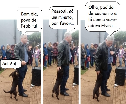 Teve evento neste sábado, em Peabiru, para entrega de ônibus, ambulância e kits esportivos. Tudo em praça pública. Na hora do discurso, o deputado Douglas Fabrício foi surpreendido pelo "Neguin", o simpático cão já conhecido na cidade por acompanhar os participantes nas trilhas dos Caminhos de Peabiru.