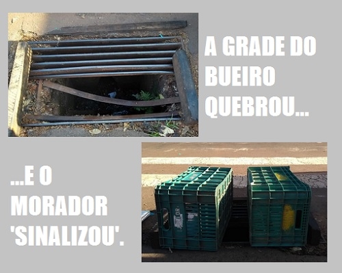 Av. Irmãos Pereira esquina com rua Harrison José Borges. Essa grade de bueiro já tinha quebrado uma vez. A prefeitura soldou, mas agora quebru de novo. De dia o vendedor de laranjas "sinaliza" com caixas, mas à noite fica na base do "seja o que Deus quiser"...