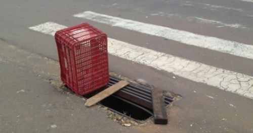 O tampa do bueiro continua quebrada e, de dia, sinalizada, por caixas de frutas, na esquina da av. Irmãos Pereira com a rua Harrison José Borges.