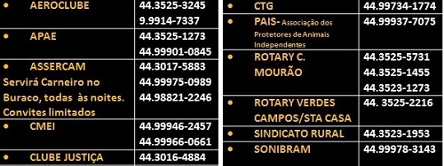 Já comprou o convite para a Festa Nacional do Carneiro no Buraco? Será domingo que vem, hein? O convite custa R$ 40 (R$ 20 para crianças). O prato típico será servido por 11 entidades. Na Assercam haverá carneiro no buraco toda noite, mas em quantidade limitada. Para quem quiser comprar, a tabela acima traz uma lista de telefones por entidade.