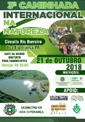 Chegou a vez de Boa Esperança realizar a 3.a Caminhada Internacional na Natureza. O circuito Rio Barreiro acontece no próximo doimingo (8h), com percurso de 12 km. A saída será no Parque Écológico. E olha a boa notícia: o café da manhã é por conta da casa (geralmente custa R$ 10). Só o allmoço (para quem quser) será pago - R$ 20. Para se inscrever: www.ecobooking.com.br.