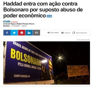 A manchete é destaque nesta quinta-feira no portal UOL. O texto fala, entre outras coisas, de outdoors espalhados com todo País com propaganda irregular do presidenciável Jair Bolsonaro. O detalhe é que a matéria é ilustrada com outdoor iluminado em Campo Mourão. A propaganda mostrada foi retirada a pedido da Justiça Eleitoral. Em tempo: a foto é de Carlos Ohara.