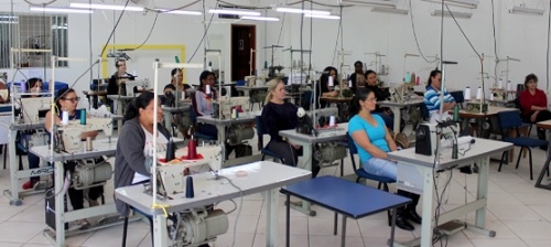 É o curso de corte e costura, com duas turmas de 15 alunos cada.
